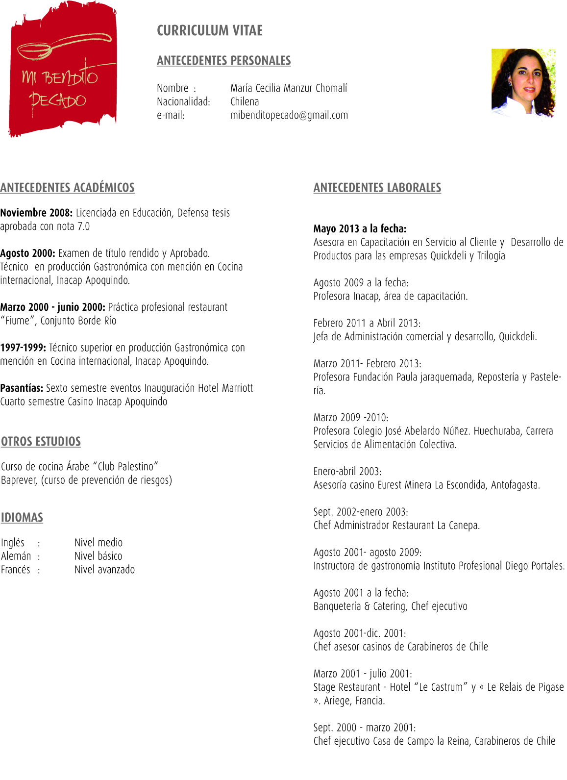 Somos un equipo de profesionales, liderado por Cecilia Manzur, como chef y dueña, he tenido un amplio recorrido por la cocina, pasando por restaurantes mediterráneos, chilenos, casinos en mineras, banquetería, hotel y restaurant en Francia y profesora de institutos profesionales en Inacap en el área de capacitación.